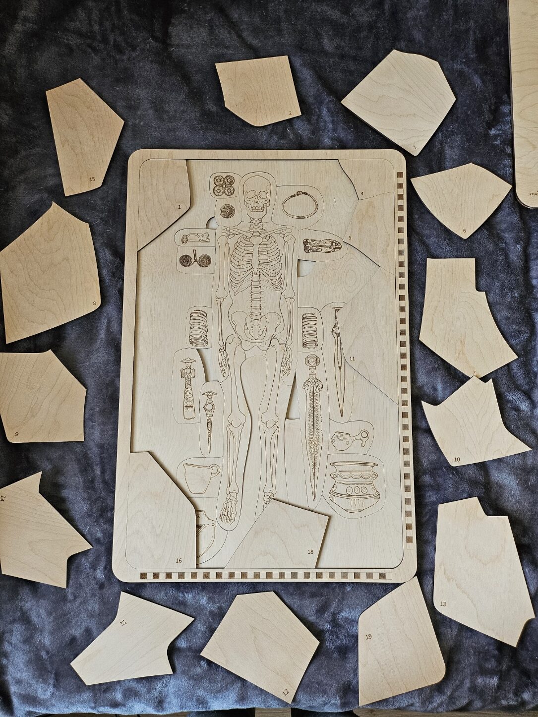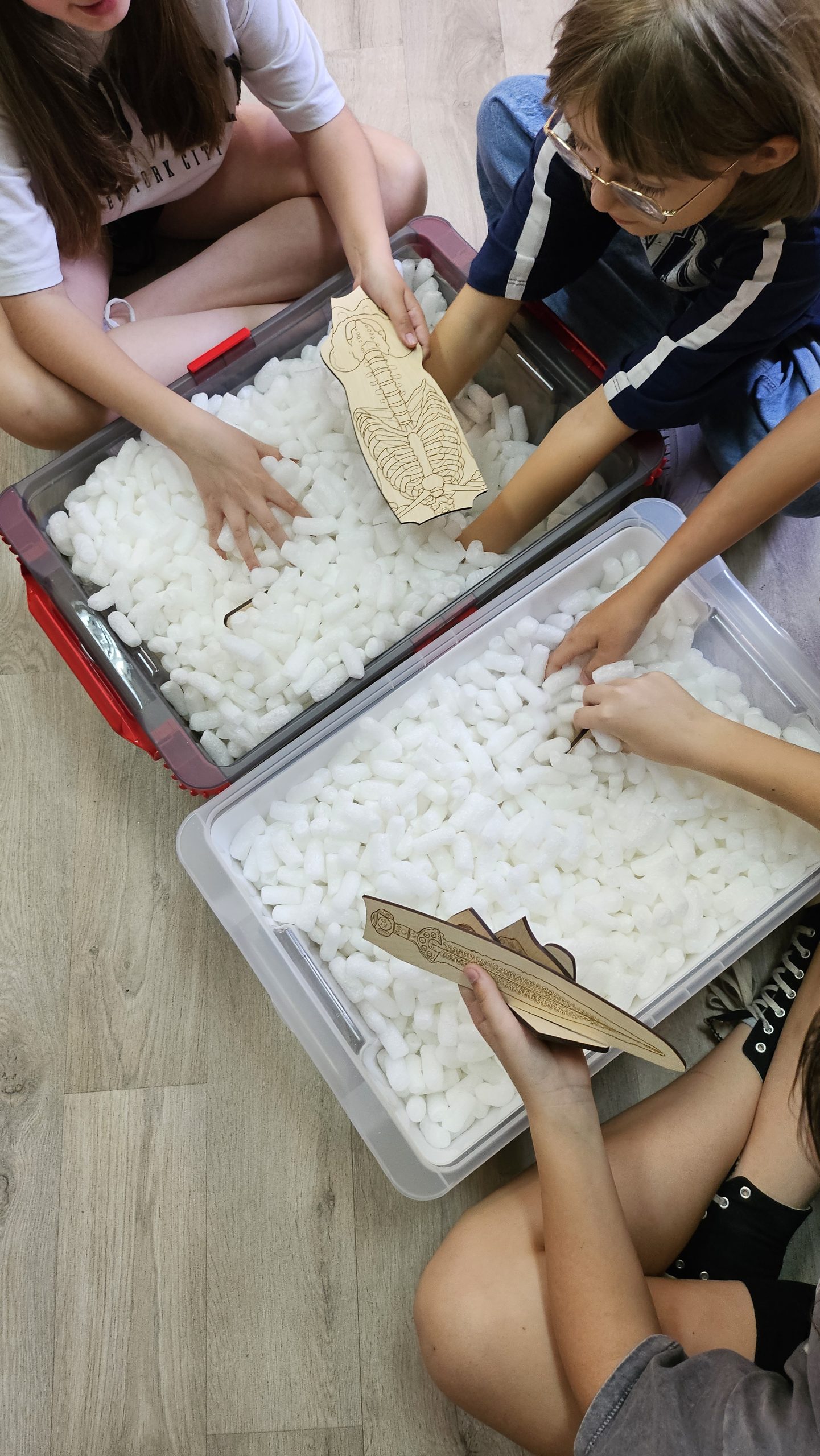 Główną częścią warsztatu jest praca na swoich pierwszych wykopaliskach! Na potrzeby zajęć zostały zaprojektowane i wykonane specjalne drewniane makiety grobów z wyposażeniem w systemie Montessori. Dzięki symulacji odkrywania grobu szkieletowego z bogatym wyposażeniem, uczestnicy mogą na własnej skórze przekonać się, jakie zadania wykonuje archeolog podczas odkrywania obiektu.
