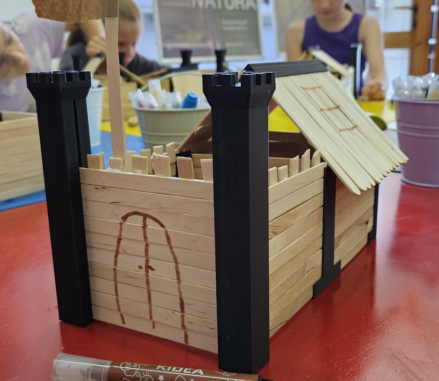 Dzięki zdobyciu tej wiedzy, w kolejnej części warsztatu, uczestnicy będą mogli przystąpić do budowy makiety zamku. Tworząc własne warownie z patyczków oraz specjalnie zaprojektowanych elementów, dzieci poznają tajniki średniowiecznych budowli.